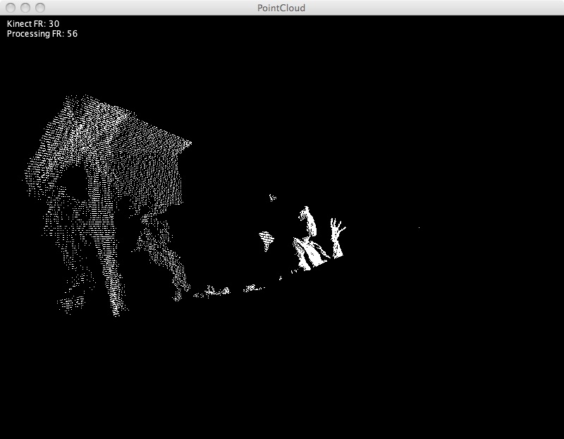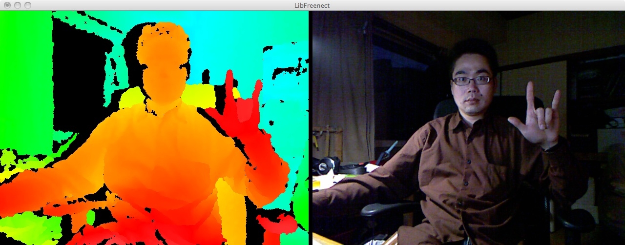 カメラに写るものへの距離が測れます。3Dで言うと、被写界深度マスクに近い。検知は赤外線アレイですな。Kinect自体がチラチラするので、投射は赤外線レーザーかな?これで、物/人の形状をサクッと背景から抜き出すのです。そのあと、骨入りの人モデルに変換してくれるはずなんですが、まだProcessingには対応していない模様。あと、kinect本体の足はモーター内蔵で、人を追いかけたり(上下左右にね)するみたいです。 |