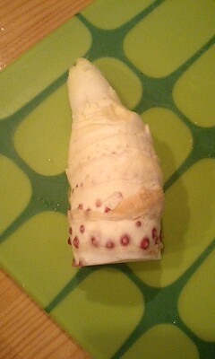 君田村の新鮮たけのこ! 2011年5月8日 by momolab Leave a Comment みっちゃんのお母さんの実家は、旧比婆郡君田村。ふきのとうやたけのこが取れる山があります。ちょうどたけのこの季節だったので、心の眼(長靴の底の足裏の感覚)で、デビュー前のたけのこを探し当ててみました。ちっちゃいのが2つとれました。 デビュー前(地表に出ていないたけのこ)は、そのままスライスして刺身で食べられました。わさび醤油でぽりぽりの食感。贅沢な週末です。 共有:Facebook続きGoogleメールアドレス印刷 関連