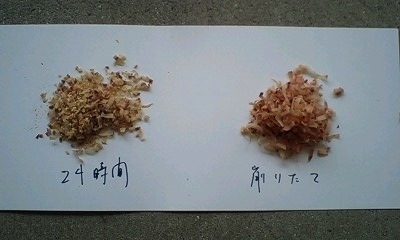 鰹節の劣化実験 2011年5月27日 by momolab Leave a Comment オカカ7号で削った鰹節を24時間放置してみました。左側が削ってから24時間放置したもの。右が削りたて。色から違います。放置したものはまぐろ・さば節のような魚っぽいにおいと味で、酸味が少々。削りたては酸味がまったくなくて旨く、シーチキンのような、薫製のような香りです。24時かンで変わるものですね。 共有:Facebook続きGoogleメールアドレス印刷 関連