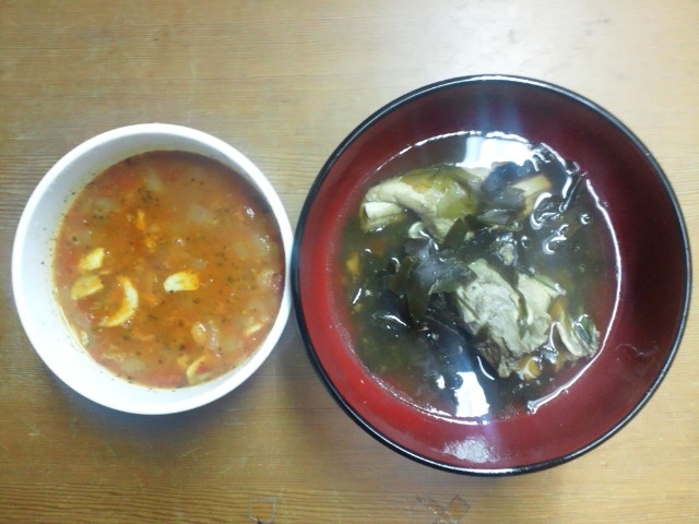 これは別の日の昼食。ひよこ豆とトマトのスープと鯛あらと羅臼の煮付け。