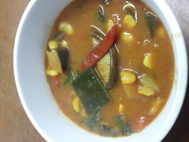 根昆布と椎茸を適当に大きめにカットして、白ワインと水で20分、そのあと缶詰の白いんげん、タマネギ、にんにく、とうがらし、カレー粉、塩こしょう砂糖を入れ、20分。以上。