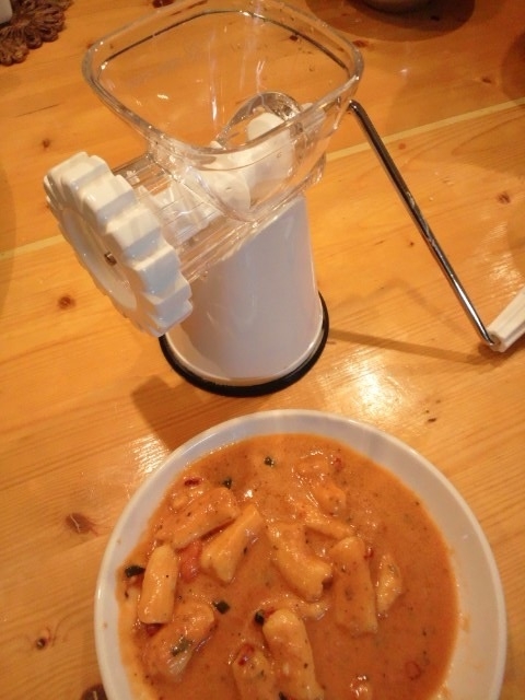 以前、自家製ソーセージを作る時、具を押し出すのがたいへんでした。今回のミンサーがあれば、ミンチの圧力でそのまま皮の中に入っていくので一石二鳥なのです。しかも、スパゲティ/リングイネ/ペンネのアタッチメントが着いてきます。30ドルなので、円高を考えるととってもお安ーい。