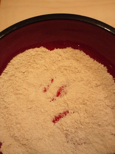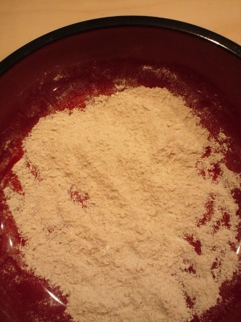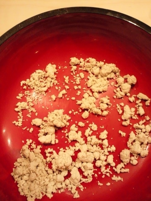 水の半分を入れ、さらさらと分散させます。粉から、パン粉みたいになります。 |