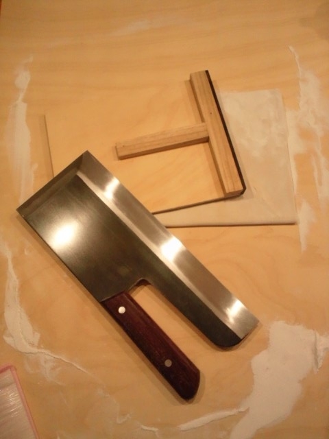 重機登場。切っていきます。包丁は、そば用の一尺一寸。ほんまもんで購入。台はホームセンターのベニヤ板。駒板は、木切れで作って、刃があたるところにハンズで買った黒檀の切れ端を接着しました。 |