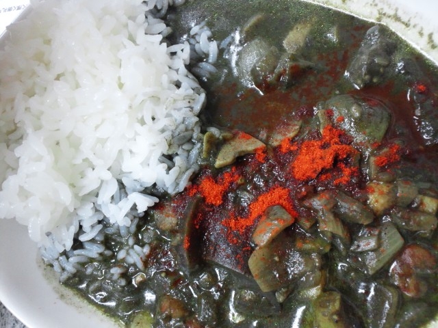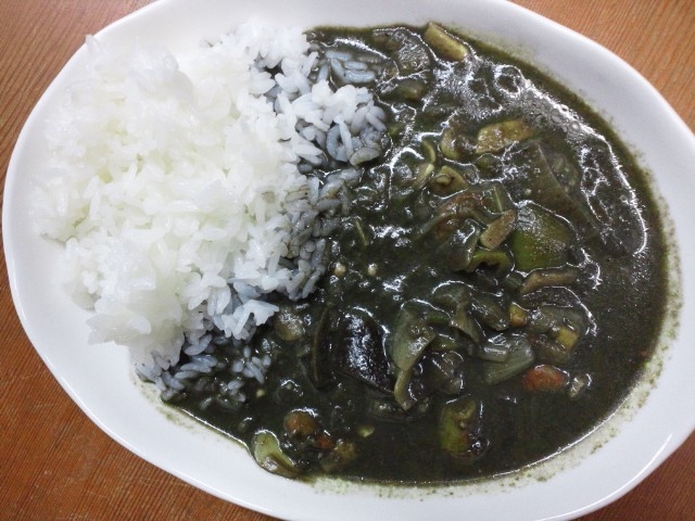 なんてことないイカ墨カレーなんです。酒のやまやにて入手しました、イカ墨。二人分づつパックしてあります。純粋にイカ墨なのです。タマネギとスパイスを炒め、ナスやタマネギを加え、水とイカ墨を加えれば良いのですが、なぜか水ではなく牛乳を入れてしまいました。黒でなく、灰色。どろどろの。