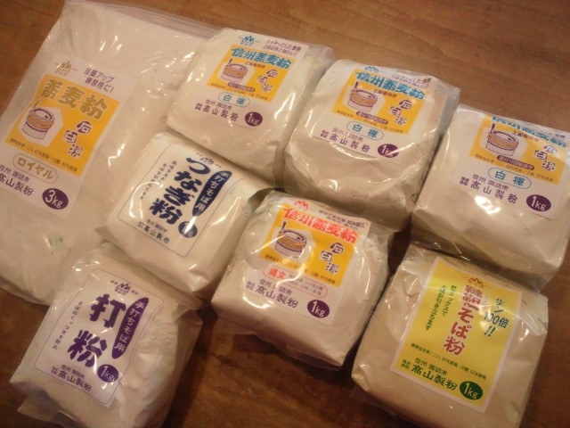 ぷちぷちした食感が気に入っている”白樺”、黒っぽく田舎蕎麦風になる”縄文”、練習用にアメリカ産そば粉”ロイヤル”3kg、おもしろそうなので”韃靼そば粉”も。