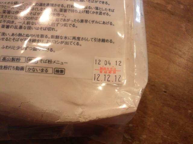 ここは、蕎麦の実を保存しておいて、注文を受けてから製粉するので新鮮でつながりやすいそば粉を購入できるのです。ということで、製造日は昨日、賞味期限は昨日から1年。