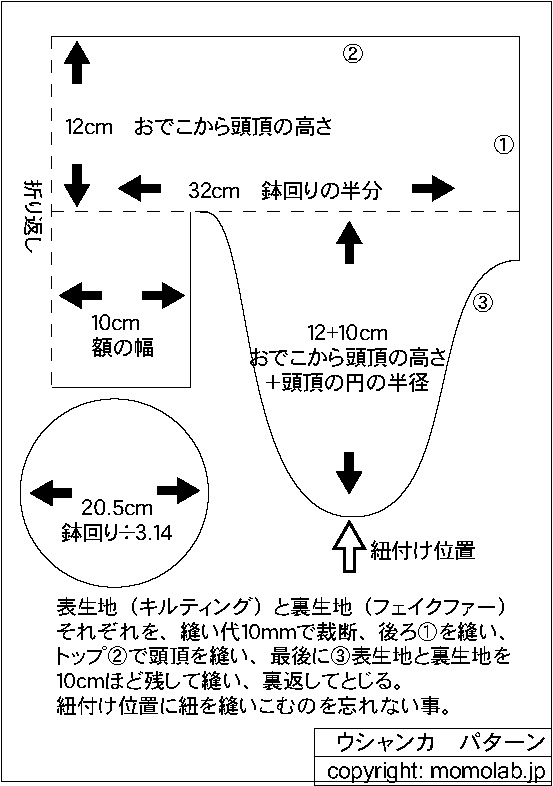 パターンはこんなかんじ。PDFはここ。ドリームにて、表にキルティング、裏にフェイクファーの肌触りの良いやつを、40センチ幅くらいで買ってきて、それぞれサイドとトップを縫い代10mmで裁断。表生地裏生地共に、表合わせで後ろ、トップと縫い合わせ、最後に表裏を縫い合わせる。ファーってふわふわしてるしまちばり面倒だし、100円ショップのクリップを大量に買ってきておくのが便利よん。強力だし危なくないし。