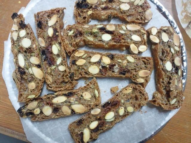 フランスパン用の生地(小麦粉100・水66・イースト2・塩1)を、普段の分量の1/2にしてホームベーカリーの食パンコースへ。こね>一次発酵>こねが終了し、二次発酵にはいったところで羽根をとりだして、そのへんにあった生アーモンド・パンプキンシード・クコの実を同量追加、手動でこねこね。焼いて、切って、オーブン120度で60分乾燥させたら完成。