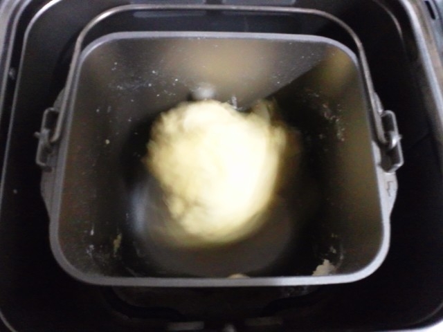 ということで、薄力小麦粉100、卵1個、ベーキングパウダー5、砂糖30あたりで、ホームベーカリーの生地コースへ。