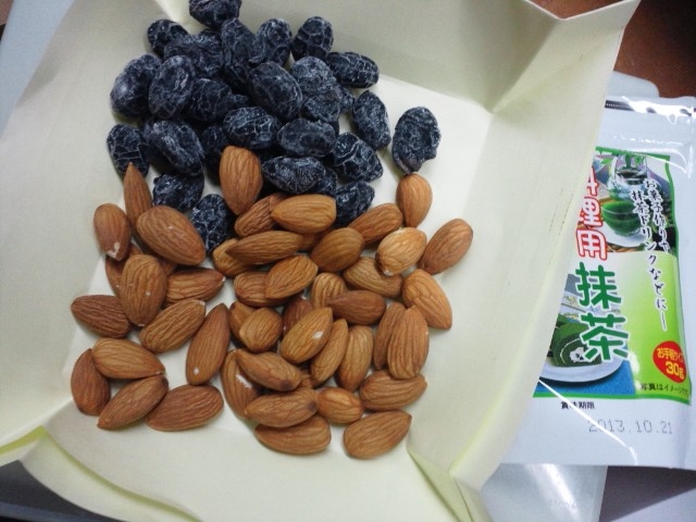 抹茶パウダーを入れるのを忘れた黒豆・アーモンドと、ヘーゼルナッツ・コーヒー、ドライフルーツ・アーモンド。