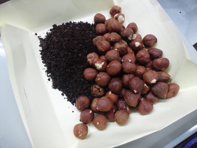 生地が練れたら、80ほどの、具を手で混ぜ込む。抹茶・黒豆・アーモンド、と、ヘーゼルナッツ・コーヒー。コーヒーはあらびきにしてそのまま混ぜ込む。