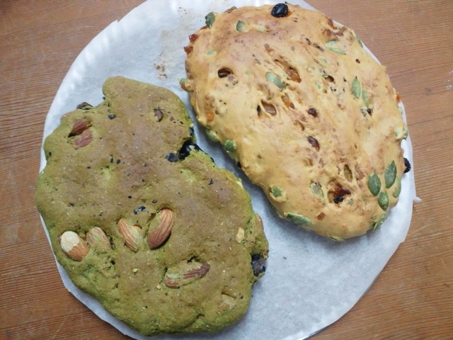 道具は、ホームベーカリーとオーブンがあれば十分だと分かった。薄力粉を使うとかなり生地がゆるいので、ホームベーカリーの生地コースで練ってもらってから具をまぜこむのが楽。フードプロセッサーでは荷が重く、全粒強力粉の場合はホームベーカリーでも止まりがちになった。平たくして焼くので、電子レンジ兼オーブンの、安いレンジで十分焼成できる。上火しかない場合、かさ上げしてヒーターに近づけたほうが表示温度に近い気がする。