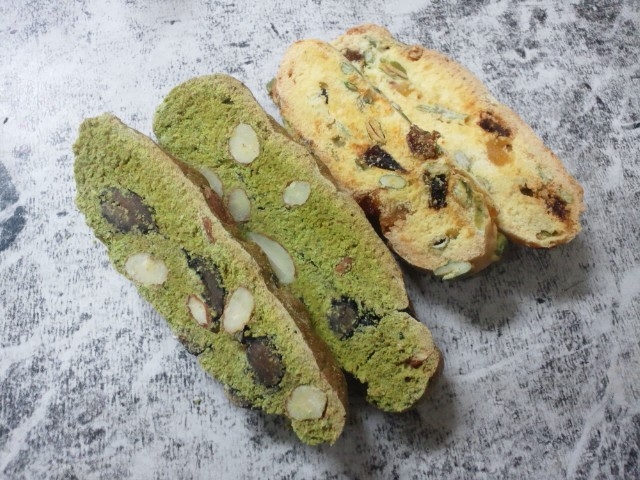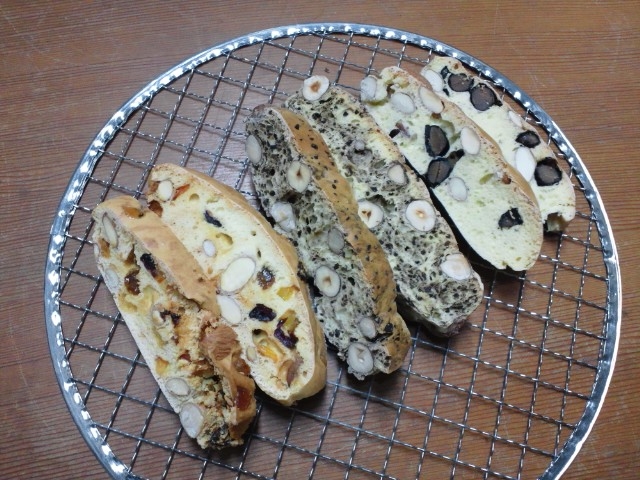ビスコッティ、練習してます。まず、基本的にまちがっていたらしい。ビスコッティは、卵とベーキングパウダーで膨らせるものらしい。粉は薄力粉のほうがキメ細かくできる気がする。
